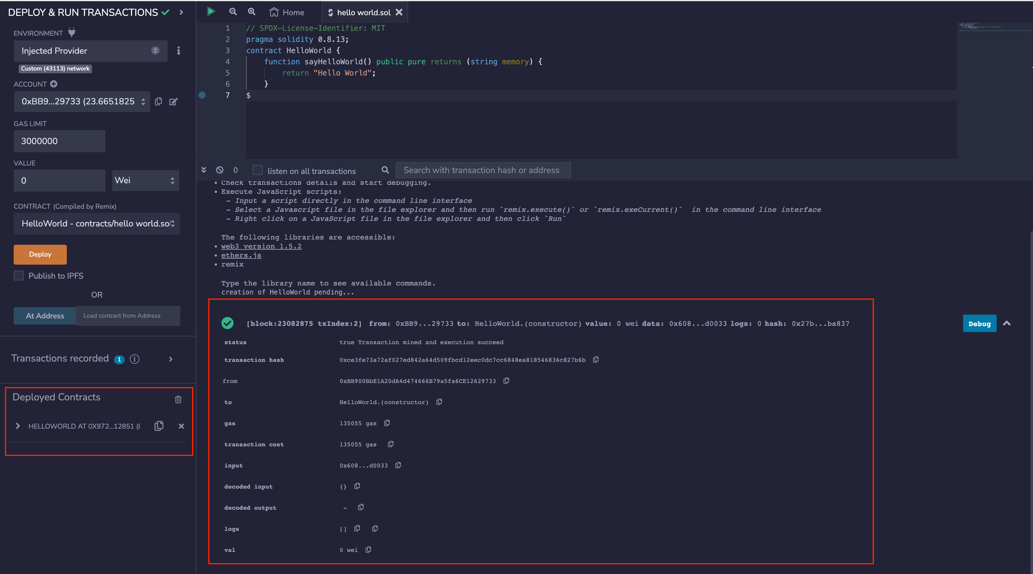 Now, the smart contract is compiled, Core is injected, and we are ready to deploy our Hello world contract. Click "Deploy."